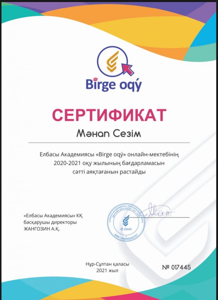 Elbasy Academy " Birge oqy" онлайн-мектебінің 2020-2021 оқу жылының бағдарламасын сәтті аяқтаған мектеп оқушысы Мәнап Сезім 6-сынып оқушысы. Құттықтаймыз!